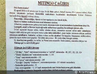 İctimai Palatanın aprelin 22-nə təyin etdiyi mitinqə çağırışla bağlı vərəqələr yayılıb. Bakının mərkəzi küçələrinə yapışdırılmış mitinqə çağırış vərəqələrində belə yazılıb: