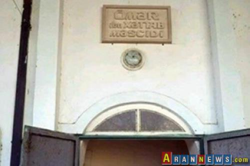 Daş üzərinə yazılmış "Ömər ibn Xəttab məscidi" tablosu 2013-cu ilin son günü məscidin girişinə asılıb.