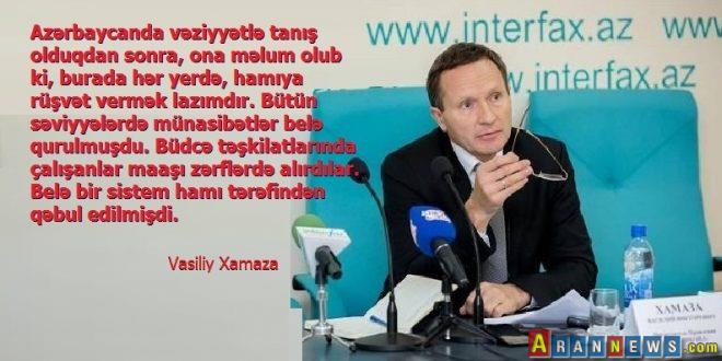 Həqiqət QHT (Truth NGO) – 2005-2011-ci illərdə Azərbaycanda Rusiya kapitallı “Nikoil” bankın idarə heyətinin sədri vəzifəsini tutmuş Vasiliy Xamaza, bu ölkənin mətbuatına Azərbaycanda işlədiyi illərdə qarşılaşdığı korrupsiya, rüşvətxorluq faktları ilə bağlı müsahibə verib.V.Xamaza Azərbaycanda vəsaitlərin mənimsənləməsində ittiham edilib. Rusiyaya qayıtdıqdan sonra Azərbaycan tərəfi onu beynəlxalq axtarışa verib.Müsahibəsində V.Xamaza deyib ki, Azərbaycanda vəziyyətlə tanış olduqdan sonra, ona məlum olub ki, burada hər yerdə, hamıya rüşvət vermək lazımdır.“Bütün səviyyələrdə münasibətlər belə qurulmuşdu. Büdcə təşkilatlarında çalışanlar maaşı zərflərdə alırdılar. Belə bir sistem hamı tərəfindən qəbul edilmişdi”.V.Xamaza deyib ki, o, bir bank rəhbəri olaraq özündən yuxarıda dayananlara rüşvət verib.“Biz rüşvət verməyə məcbur idik. Bütün böyük “ödəmələr” Müşahidə Şurasının sədri ilə razılaşdırılırdı. 50 min manatlıq rüşvət xırda pul sayılırdı. Misal kimi deyə bilərəm ki, məhkəmə prosesləri zamanı “ödənişlər” məcburi idi. Hətta haqlısansa, məhkəməyə qərar çıxarılması üçün ödəmək lazım idi. Hakimlərə pulu hüquqşünaslar aparırdı. Sonradan məhkəmə icraçılarına da rüşvət vermək lazım gəlirdi. Rüşvətin həcmi məhkəmədə udulan məbləğdən asılı olurdu. Əks halda bizim udduğumuz iddia əsasında məhkəmə icraçıları işə başlamırdılar. Ümumiyyətlə hər kəsə və hər şeyə görə rüşvət vermək lazım gəlirdi- icazə, lisenziya, yanğınsöndürənlər və sairə”.Azərbaycanda bank sisteminin fəaliyyətinə toxunan V.Xamaza bildirib ki, banklar filiallarına hər bir verilən kreditin hansı hissəsinin rüşvət kimi geri alınması barədə göstəriş verirdilər. Özünün bu sistemi ləğv etdyini bildirən, V.Xamaza yuxarılara rüşvət üçün pulun bankın rəhbər şəxslərindən birinin adına yazdığını, sonradan isə hesabatlarda həmin məbləğin bankın zərəri kimi göstərdiklərini bildirib. Onun sözlərinə görə, rəhbərliyin bütün bunlardan xəbəri var idi. Konkret rüşvət hallarından danışan V.Xamaza bir hadisəni misal kimi göstərib.